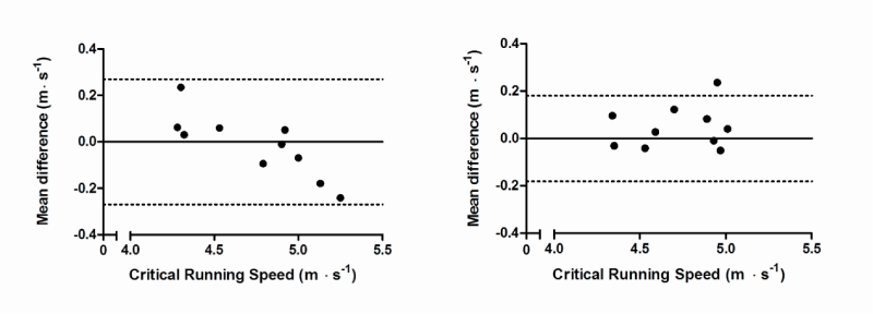 Figure 1: Bland-Altman plots of the Critical Running Speed test–re-test differences between trials 1 and 2 [left] and trials 2 and 3 [right]. The solid horizontal lines represent mean bias, whilst the dashed lines represent the 95% limits of agreement.