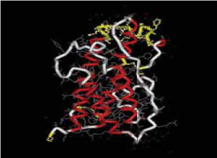 | Figure 2: The growth hormone somatropin, in its correct 22-kD-hGH form. Three-dimensional structure, generated from the protein data base SWISS PROT. Structural data supplied with the help of the program RasMol. The n-terminal amino acid (at the bottom left hand corner) is marked yellow, as are the disulphide bridges (and the sequence range missing on the 20 kDa hGH variant). The ranges with an α-Helix-structure are marked in red. |