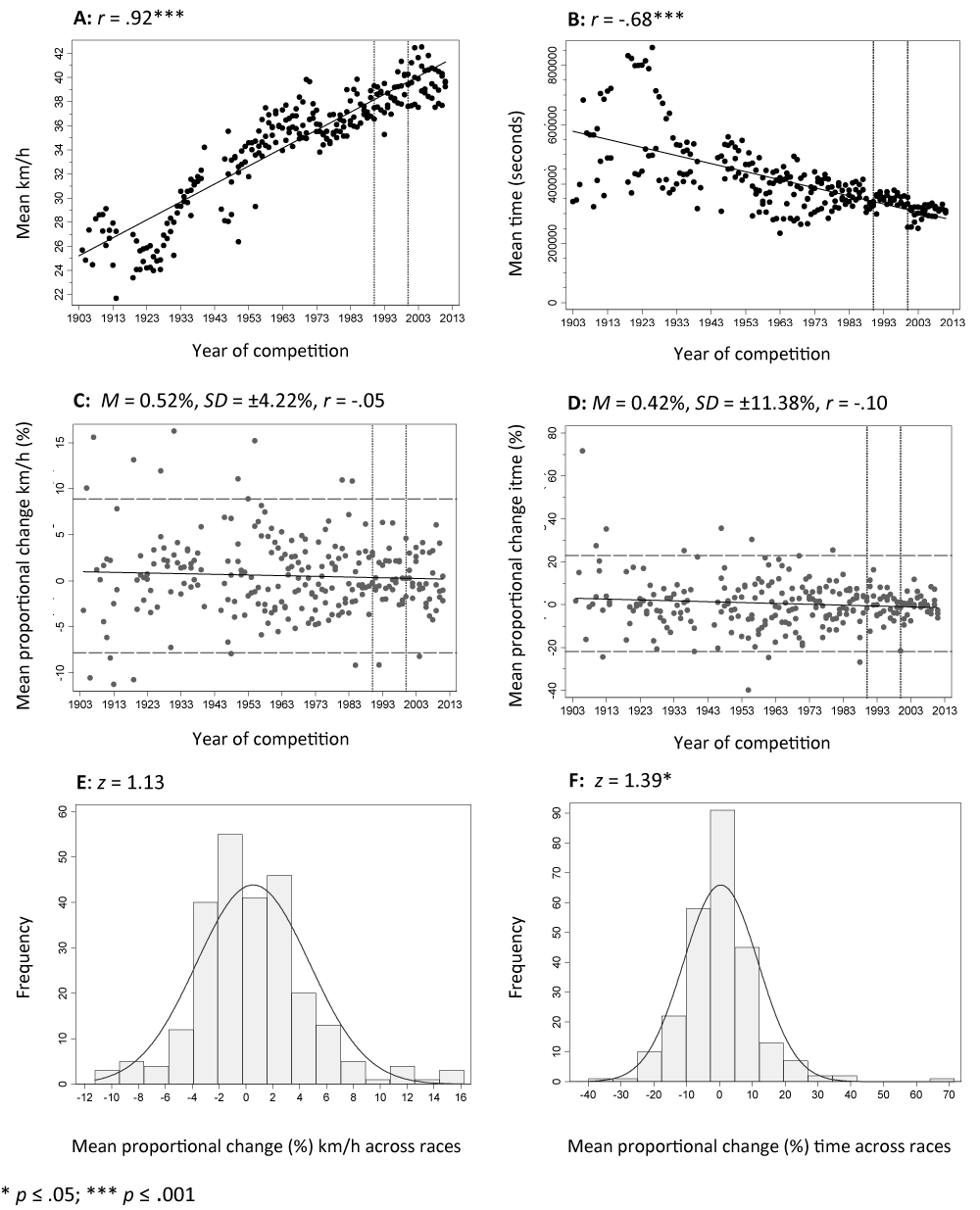 | Figure 3: Panel A and B present Pearson correlation coefficients between competition year and winning riders’ mean km/h and time performances across stage races. Panel C and D show the Pearson correlation coefficients between competition year and the mean proportional changes (%) per year for both performance measures, averaged across races. Panel E and F present the distribution of the latter performance measures. Vertical dotted lines mark the epo era (1990–2000), horizontal dashed lines present the individual 95%–prediction interval. |