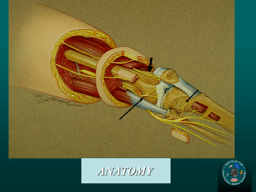 | Figure 2: Lateral view of the innervation of the knee. The skin in this area represents the terminal branches of the lateral femoral cutaneous nerve. The lateral joint structures are innervated by a branch of the sciatic nerve that comes from the popliteal fossa, goes deep to the biceps tendon to enter the joint, the lateral retinacular nerve (long thin arrow). The nerve passes just distal to the vastus lateralis, and then lies superficial to the synovium and deep to the lateral retinaculum as it enters the joint. The branches of the sciatic nerve to the posterior knee joint capsule are shown next to the femur posteriorly. The branch to the pre-patellar bursa is shown on the anterior surface of the femur as it exists the vastus intermedius. The innervation of the proximal tibiofibular joint is shown as branches proximal and distal to the fibular head, arising from the common peroneal nerve (short arrow). The terminal branch of the nerve to the vastus intermedius innervates the prepatellar space (short thick arrow). (with permission, Dellon.com). |