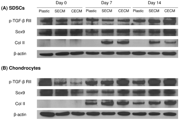 | Figure 6: Western blot was used to evaluate protein level of chondrogenic markers (Sox9 and collagen II) and phospho-TGF-β RII (Tyr 424) in the 14- day chondrogenically induced pellets from expanded passage 6 SDSCs and chondrocytes. β-actin was used as an internal control for protein loading. |