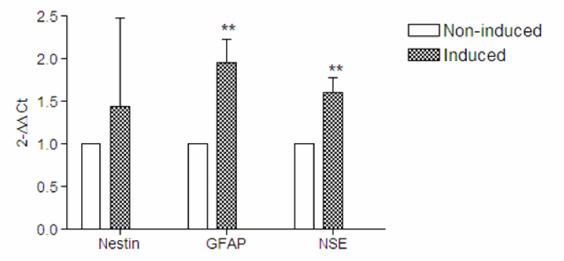| Figure 2: Expression of “neuronal marker” genes in non-induced and induced ADAS cells. Non-Induced - ADAS cells grown under control conditions in DMEM, 10% FBS, 1% streptomycin-penicillin and 0.1% entamycin. Induced- ADAS cells after 24 h culture in neuronal induction medium. **(P<0.003). |