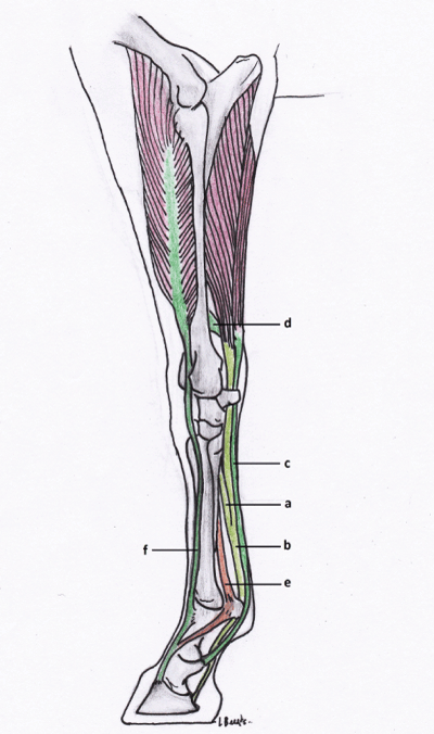 | Figure 1: Lateral view of the left thoracic limb with the following structures: (a) the accessory ligament of the deep digital flexor tendon (carpal check ligament), (b) the deep digital flexor tendon, (c) the superficial digital flexor tendon, (d) the accessory ligament of the superficial digital flexor tendon (radial check ligament), (e) the suspensory ligament, and (f) the common digital extensor tendon. |