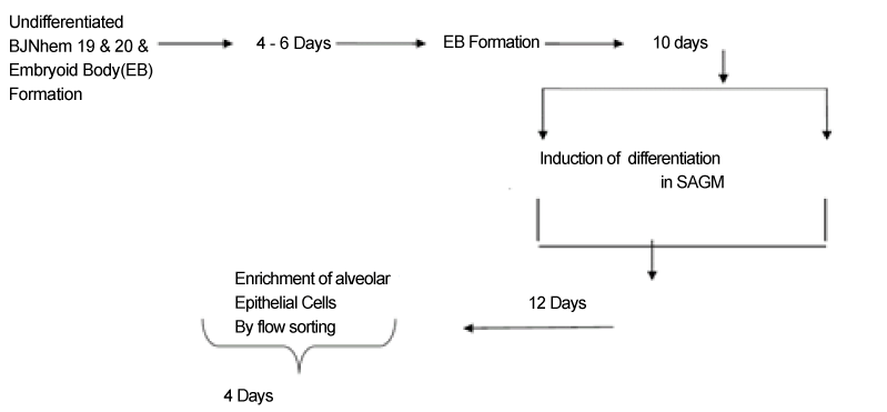 | Figure 1: Outline of formation of EBs from Bjnhem20 cells and differentiation to alveolar epithelial cells in SAGM. Differentiation of BJNhem19 and BJNhem20 cells to lung epithelial cell – specific lineage. An outline of formation of EBs from BJNhem19 and BJNhem20 and differentiation to alveolar epithelial cells in SAGM and BEGM [22] |