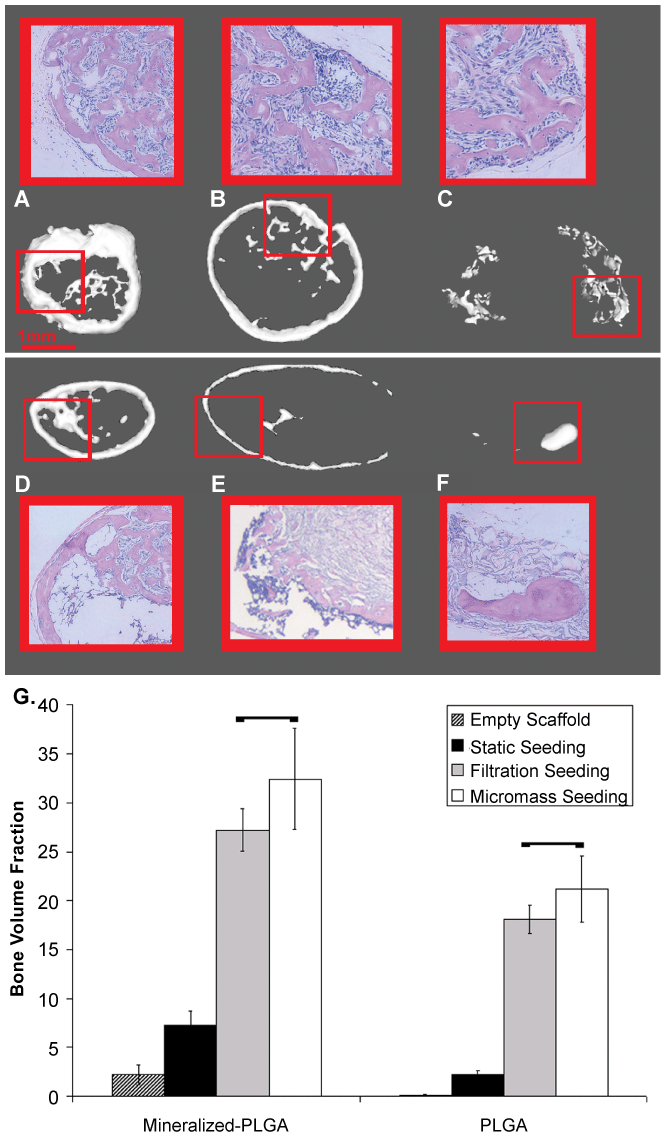 | Figure 5: Volume fractions and patterns of osteogenesis vary as a function of scaffold surface and seeding techniques. Macromass seeded scaffolds produce smaller ossicles, with a more abundant mineralization in the core of the scaffold (A, D). Filtered scaffolds (B, E) show a larger shell of bone formation with little or no mineralization in the core of the scaffold in both CT renderings and H&E histological sections. Static seeded scaffolds produce scant mineralization and bone formation (C, F). Mineralization enhances mineral coverage and BVF in all groups. These significant differences as a function of surface material and initial seedingwere quantified (G). Both the micromass and filtration seeding yielded significantly larger BVF than static seeding (p<0.001). Although there was no significant difference between the filtration and macromass seeding, the variability is 2-fold greater in the macromass implants. Mineralized scaffolds showed a significantly higher BVF with all seeding techniques than did their PLGA counterpart (p(micromass)0.037, p(filtration)=0.013, p(static)=0.009). Bars indicate groups that are not significantly different. |