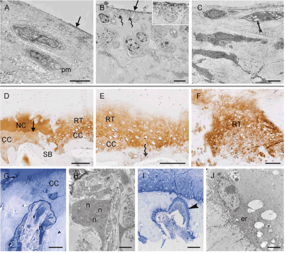 | Figure 7: Upper and lower boundary of the RT. A-C: TEM images of the surface of the RT in treated defect (A, B) and the control (C). A: Elongated chondrocytes surrounded by a pericellular matrix (pm) are arranged parallel to the joint surface. The cells are surrounded by dense ECM, which is covered by a thin layer of electron-dense matrix (arrow). B: The cells at the surface extend cell extensions (wavy arrows and insert) and lack a pericellular matrix but are also embedded in dense matrix covered by dark material (arrow). C: Polygonal cells with many cell extensions and extended ER (arrow) are embedded in fibrous matrix. No electron dense material is visible at the surface. D-F: Immunohistochemical reactions against collagen type II in the deep region of transplanted defect show local differences of RT, CC and SB. D: Residual, homogeneous and intensively stained NC above a homogeneous, brighter-staining CC and unstained SB. The arrow indicates the tide mark. Adjacent to this there is collagen type II positive but somewhat fibrous RT. The underlying CC is hardly distinguishable from the RT but slightly brighter. A similar situation is also visible at the left side in E. E: In the middle of the image the trabeculae of the bone are very thin and the partially decalcified cartilage extends down to the bone lacuna of the subchondral bone (wavy arrow). F: Strong staining of the RT adjacent to a perforation of the SB. G,I: Toluidine blue and H,J: TEM images of cellular activity in the SB in transplanted defects. G,H: Osteoclasts with several Nuclei (n) are resorbing the SB such that the bone marrow lacuna penetrates the CC. I, J: Osteoblasts with abundant ER (er) deposit osteoid (arrowhead). Images A, B, D, E, I and J were taken form cartilage defect treated with a double sandwich-like layer of a hyaluronan web and a collagen type I/III fleece, C from the control defect without transplant, F from the defect treated with a single collagen type I/III fleece layer and G, H with chondrocytes on a single hyaluronan web layer. Scale bars: (A-C) 5 µm, (D-F) 100 µm, (G) 30 µm, (H) 10 µm, (I) 50 µm, (J) 2 µm. |