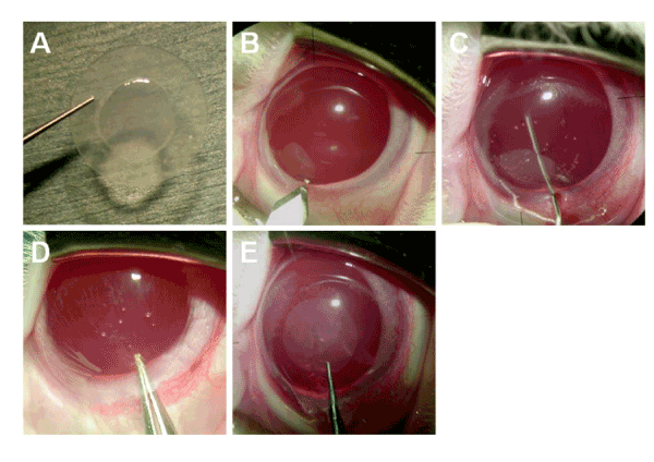 | Figure 3: Procedure for HCEC sheet transplantation. (A) HCEC collagen sheet on a silicon plate. (B) A 6-mm sclerocorneal incision centered at 12 o’clock is made with a slit-knife. (C) A 6.0-mm diameter circular Descemetorhexis was performed with a 30-gauge needle and Descemet’s membrane was removed from the anterior chamber. (D, E, F) The HCEC sheet was inserted into the anterior chamber using the forceps (D) or a foldable silicone plate (E) and attached to the posterior stroma (F). |