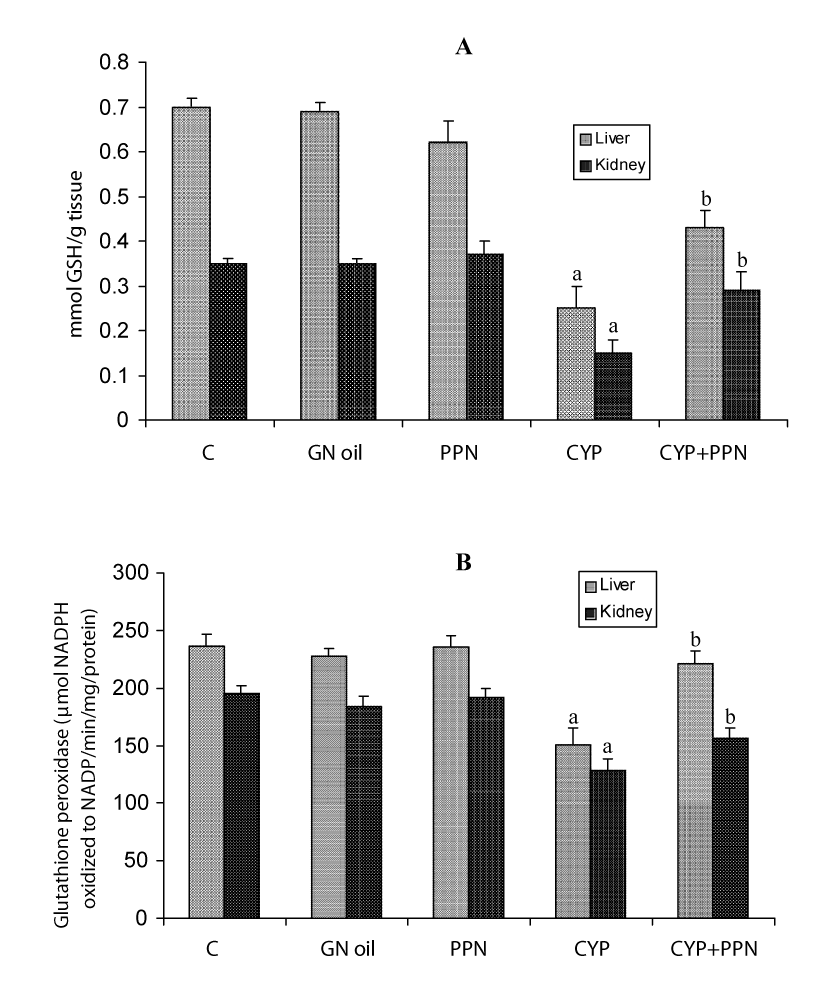 | Figure 2: Effects of 28 days oral administration of CYP, PPN and CYP plus PPN on reduced glutathione (A) and glutathione peroxidase (B) of liver and kidney in male rats. Each bar represents mean ± SE of 6 rats. Significant differences are indicated by superscript a compared to control, superscript b compared to CYP group. C: control, GN oil: ground nut oil PPN: piperine, CYP: cypermethrin, PPN at 50 mg/kg and CYP at 25 mg/kg. |