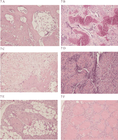 | Figure 7: Light micrographs of tumours formed in nude mice by a cloned cell line established from dog No. 353. A low-grade osteosarcoma with abundant presence of bone matrix and few tumour cells, also an area of suspected bone marrow-like cells (*) were seen (No. 1-3), (A). A high-grade osteosarcoma from the same clone with a large number of tumour cells and less matrix is shown (No. 1-5), (B). Tumours formed by clone No.2 were low-grade to high-grade and as shown in panel C, a calcified (deep purple) bone matrix was seen in the low-grade part of the formed osteosarcoma (No. 2-1), (C). In another tumour formed by the same clone, lowgrade bone tissue was seen in the centre whereas a loose matrix formed the periphery of the tumour (No. 2-2), (D). One of the clones did not form bone tissue in the mice but formed highgrade spindle-cell tumours. These tumours grew very invasive and infiltrated the surrounding tissues such as fat tissue, peripheral nerves (E) and the skeletal muscles (No. 6-1B), (F). Objectives x 20 of haematoxylin and eosin(HE) stained sections. |