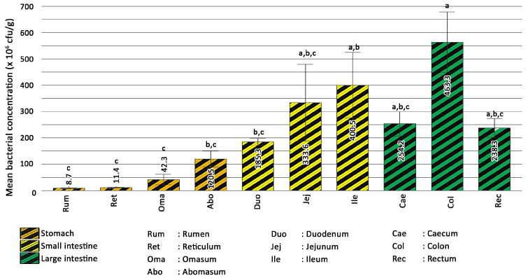 | Figure 5: Average (± SEM) comparison between concentrations of Pasteurella multocida B:2 in different parts of the luminal gastrointestinal tracts of Group 2 following experimental exposure. |