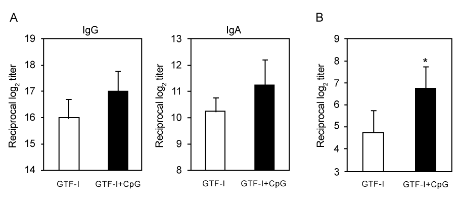 | Figure 2: GTF-I-specific serum IgG and IgA (A), and IgA antibody titers in saliva (B). Groups of mice were nasally immunized with 20µg of GTF-I alone (open bars) or 20µg of GTF-I plus 10µg of CpG ODN (closed bars) on days 0, 7, and 14. Serum and saliva samples were collected at day 21 and were assessed for 40k-OMP-specific antibody titers. The results are expressed as the mean ± S.E. obtained for five mice per group. The P values for serum IgG, IgA and salivary IgA antibody titers with GTF-I alone or with GTF-I plus CpG ODN are <0.05 when compared with PBS. *p<0.05, compared with GTF-I alone. |