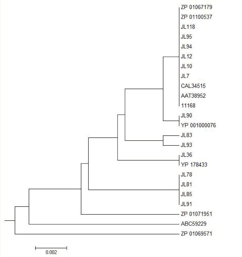 | Figure 1: Phylogenetic relationship of CmeC from diverse C. jejuni strains. The amino acid based dendrogram was constructed by neighbor-joining methods in MEGA 4.0. The strains with ‘JL’ prefix were used for cmeC gene amplification and sequencing in this study and the complete cmeC sequences of these strains have been deposited in GenBank. The CmeC sequences of other strains are the public database NCBI (http://www.ncbi. nlm.nih.gov/). |
