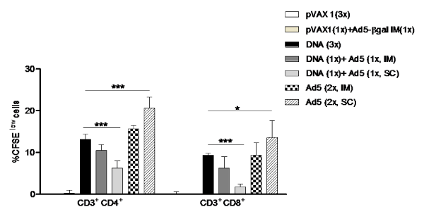 | Figure 1: Immunization with an adenovirus encoding the multiepitope gene (Ad5-HIVBr18) elicits higher proliferative responses when compared to other regimens. BALB/c mice (6 per group) were immunized intramuscularly (IM) with the DNA vaccine HIVBr18 (3 doses); or received 2 doses of 2x108 PFU of recombinant adenovirus (Ad5) by intramuscular (IM) or subcutaneous (SC) route; or received a heterologous prime-boost regimen based on a DNA prime (IM), Ad5 boost (IM or SC). Control groups received pVAX1 plasmid and/ or Ad5-ßgal.Two weeks after the last immunization; splenocytes from each immunized group were pooled, labeled with CFSE (1.25µM) and cultured for 5 days, in the presence of 5µM of pooled HIV-1 peptides. Cells were analyzed by flow cytometry and CFSE dilution on gated CD3+CD4+M or CD3+CD8+ cells was used as readout for antigen-specific proliferation. Cutoff values were 1.7% for CD4+ and 1.5% for CD8+ T cells. Only significant differences with the DNA immunized group are depicted (*p<0.05 and ***p<0.001). DNA= HIVBr18; Ad5= adenovirus 5 encoding HIVBr18. |