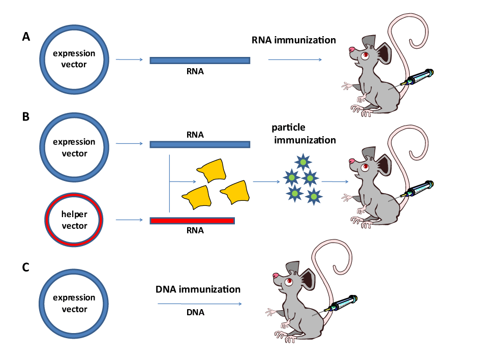 | Figure 1: Alphavirus vectors applied in vaccine development. A. Naked RNA vector: In vitro transcribed RNA is directly injected into animals. B. Replication- deficient recombinant particles: Replicon particles are obtained from in vitro transcribed RNA from expression and helper vectors after co-electroporation of BHK-21 cells. C. Layered DNA vectors: Plasmid DNA can be used directly for immunization. |