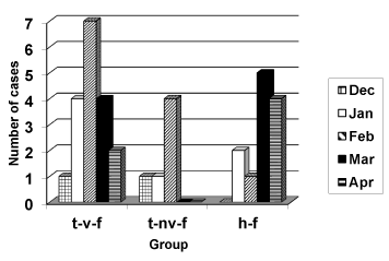 | Figure 1: Month during which influenza occurred by group T-v-f=Transplant recipients who developed influenza despite influenza vaccination T-nv-f=Transplant recipients who developed influenza in the absence of influenza vaccination H-f=Healthy people who developed influenza. |