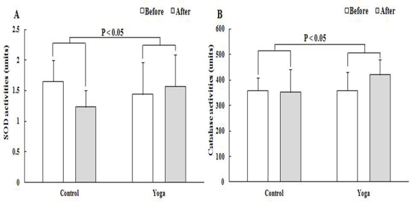 | Figure 2: Changes of SOD and catalase activities in the serum levels. Participants were taken control treatment or yoga training class for 12 weeks. Serum levels of SOD activities (A) and catalase activities (B) were measured from serum samples after 12 weeks each class. Data were expressed as means ± SD (n=12 control group, n=13 yoga group, respectively). The p-value was compared with the change values of control group. |