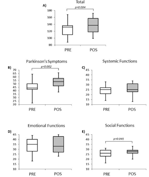 | Figure 2: Box-plots of scores obtained across all participants before and after the implementation of interventional protocol (white and gray bars, respectively). Panel A shows the added scores (Total score) from each of the four domains. Panels B-E shows the scores obtained separately from each of the four domains (Parkinson’s symptoms, Systemic functions, Emotional functions, and Social functions, respectively). |