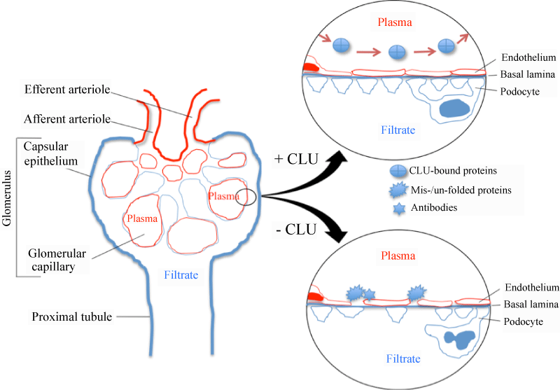| Figure 3: A simple scheme of hypothesis for the cytoprotection of sCLU in the kidney. Under normal condition or when physiological stress is minimal (+ CLU), sCLU in the plasma acts as a non-specific extracellular chaperone for all kind of mutant, misfolded and unfolded proteins, and prevents autoimmune response to and renal deposition of these ‘nephrotoxic’ proteins. Serum sCLU may also facilitate the protein clearance and intracellular sCLU maintains tissue homeostasis in the kidney. When the physiological stress is increased or under certain pathological condition (- CLU), misfolded and/or unfolded proteins are up-regulated both in the plasma and inside the cell. As a result, there is not enough sCLU to neutralize the accumulation of these proteins – leading to the immune activation and the deposition of these proteins in glomerular capillaries, and renal cell death via ER stress. |