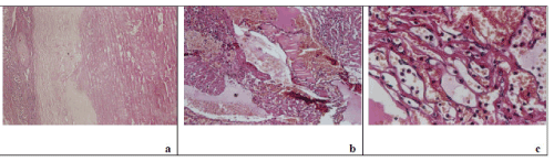 | Figure 2: a-c) Hematoxylen-Eosine staining. (a) Vascular proliferation (right) lined by a fibrous capsule in renal parenchyma (left) (x 40). (b) Cavernous structures filled with erythrocytes (x100). (c) Central vascular networks lined by endothelial cells without cellular atypia or mitosis (x400). |