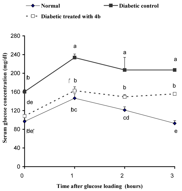 | Figure 1: Effect of pyrimido[1,6-a]quinazoline derivative 4b on oral glucose tolerance of n5-STZ-induced diabetic male rats. |