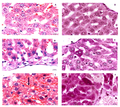 | Figure 2: Histological sections of male Wistar rat livers after treatment with Oncidium flexuosum Sims. crude extract. A, B, C) Sections stained with hematoxylin-eosin and D, E, F sections submitted to periodic acid Schiff. A, D) Control group; B, E) group G250; C,F) group G500. Note in B and C, hepatocyte hypertrophy and cytoplasmic vacuolization, and in C, hyperemia (arrow) and nuclear pyknosis. (s) sinusoids. |