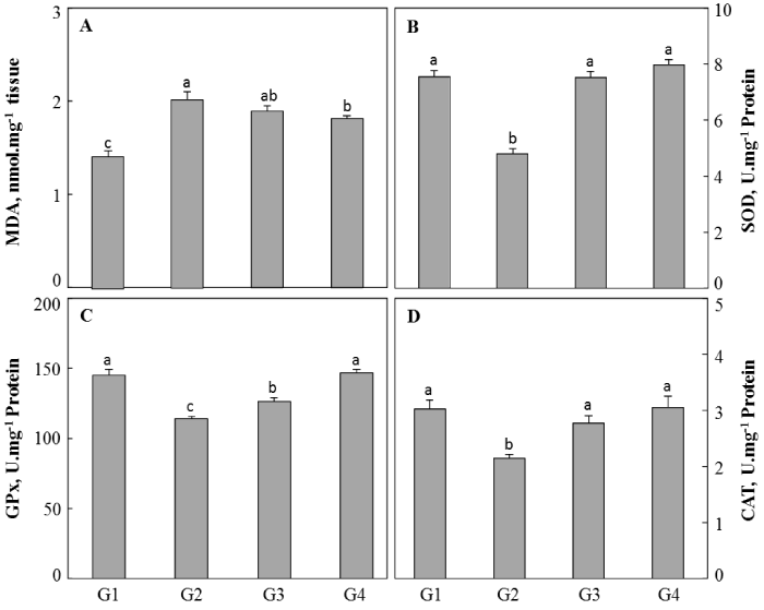 | Figure 1: Effect of ATRA and/or bleomycin treatment on MDA levels and SOD, GPx and CAT activities in lung tissues of treated rats. Values are the means of 8 replicates ± SD. For each parameter, different letters indicate significant differences at P ≤ 0.05 as determined by Duncan’s multiple range tests. |