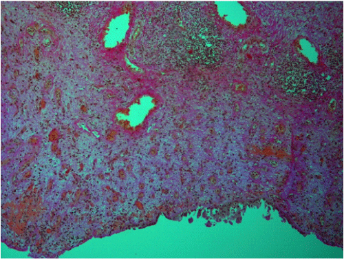 | Figure 6: Chronic erosive cystitis. Wide erosion of bladder epithelium (bottom). Lamina propria shows neoangiogenesis (granulation tissue), edema and early collagenic fibrosis. Focal mononuclear inflammatory infiltration, formation of lymphoid follicles, and more mature fibrosis (top). van Gieson, x120. |