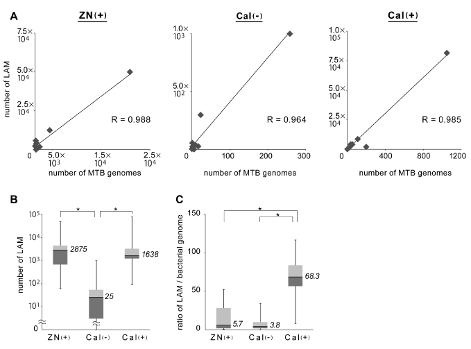 | Figure 5: Calcified granulomatous lesions contained many granules reacted by anti-LAM mAb relative to the number of bacterial genomes. (A) Correlation graphs of the number of LAM-containing granules and the number of bacterial genomes in the three groups. Correlation coefficient=0.988 in ZN(+) group, 0.964 in Cal(-) group, and 0.985 in Cal(+) group. (B) Numbers of LAM-containing granules in the three groups are expressed by boxplots on a logarithmic scale. (C) Ratios of the number of LAM containing granules divided by the number of bacterial genomes in the three groups are expressed by boxplots. n=10 in the ZN(+), 13 in the Cal(-), 11 in the Cal(+). *P<0.05, Steel-Dwass test. |