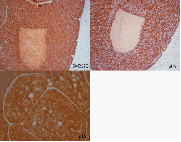| Figure 4: Immunohistochemical stain revealed strong reaction for 34ßE12 (original magnification 40x), strongly nuclear stain for p63, delineate perfectly the peripheral palisading (original magnification 40x) and p16 in a neural-type rosettes area (original magnification 40x). |