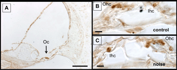 | Figure 2: γ-H2Ax labeling in scala media. Panel A shows that several structures are labeled but the most prominent is the organ of Corti. γ-H2Ax labeling can be detected in the organ of Corti with (panel C) and without (panel B) noise exposure. The labeling is predominantly localized in hair cells and supporting cells. Abbreviations: Oc, organ of Corti; Ohc, outer hair cell; Ihc, inner hair cell. The scale bar in panel A is 100 μm and the scale bars in panels B and C are 10 μm. |