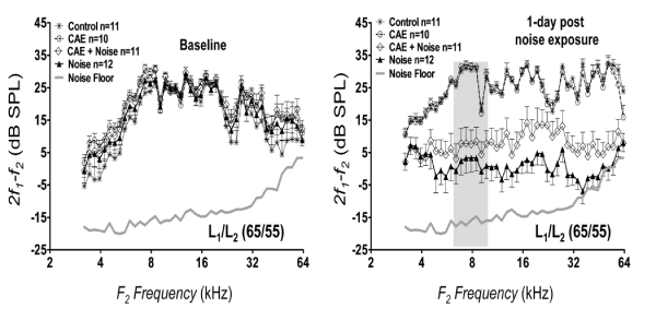 | Figure 4: Protection from noise injury. The levels of 2f1 - f2 as a function of f2 frequency (DP-gram; L1/L2 = 65/55) are shown for each treatment group at baseline and 1 day post-noise exposure. The vertical gray bar in this and all figures represent the frequency range of the damaging noise. Both the noise-only group and the CAE+noise group were exposed in the same noise exposure chamber at the same time. Note that the CAE+noise group exhibited better (higher) levels than the noise only group at 1 day post-noise exposure. Errors bars are standard errors of the means. |