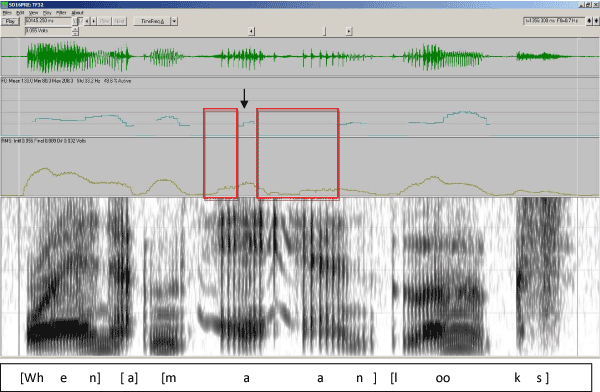 | Figure 4: Low track activity (red boxes) produced by a speaker with ADSD, Pre-BT. Note: long duration of the sound [a] in “man” from the phrase “When a man looks…” This segment has a “zeroed” f0 track (< 80 Hz) where modal f0 was traceable, between red boxes, for only 18% of [a] in the word [man]. Intervals of zeroed f0 correspond to isolated glottal pulsing on the waveform (top) and vertical striations on the spectrogram (bottom). This was perceived as severely strained-strangled voice with reduced intensity and associated voice breaks. |