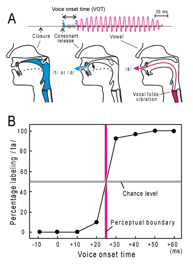 | Figure 3: A: Schematized waveform of plosive consonant-vowel (CV) syllables, /da/ or /ta/, and midsaggital configuration of the vocal tract during articulation. The signal comprises several physical hallmarks reflecting distinct articulation processes: Closure, Consonant release, Voicing and Voice onset time (VOT). Closure: the airway is closed by a set of articulators (alveolar ridge and tongue tip, in this case) so that no air can escape, thereby raising air pressure behind the articulators. Consonant release: downward movement of the tongue tip creates a narrow crevice, through which air explosively passes with generating brief turbulence noise (blue arrow). Voicing: the configuration of the glottis and the stiffness of the vocal folds are adjusted to permit continued vocal-folds vibration, which creates a vowel (red arrow). “Voice onset time (VOT)” is referred to as the interval between the onset of Consonant release and that of Voicing (Based on Stevens [20]). B: The mean performance of native English speakers in psychoacoustic experiments using /da/-/ta/ syllables with variable VOT. The ordinate gives the mean percentage of identifying /ta/. The abscissa gives VOT. The red line represents the “VOT boundary” where this psychometric function curve crosses the chance level (= 50%) (Modified from Lisker and Abramson [47]). |