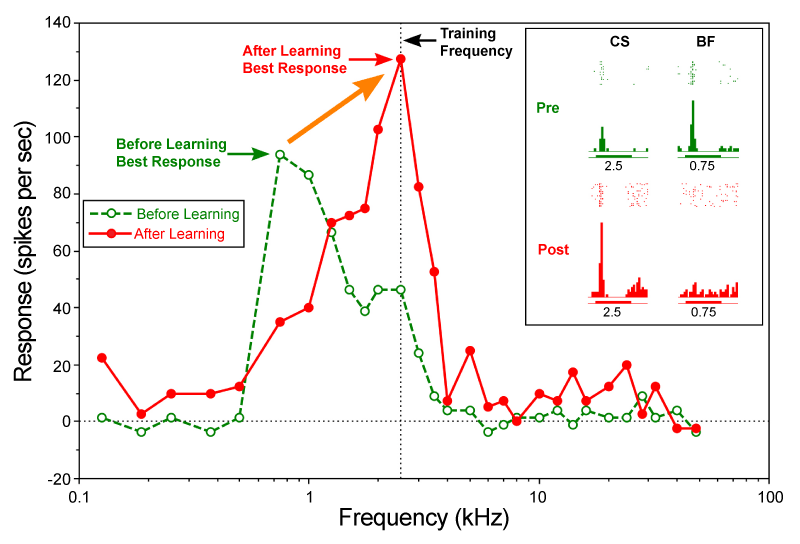 | Figure 1: Associative learning produces tuning shifts. An example of a complete shift of frequency tuning of a single cell in A1 of the guinea pig from a pre-training best frequency (BF) of 0.75 kHz to the CS frequency of 2.5 kHz after 30 trials of tone – shock pairing, during which the guinea pig developed a cardiac conditioned response. Inset shows pre- and post-training cellular responses (rasters) for the pre-training BF and the CS frequencies. Note the marked increase in neuronal discharges to the signal frequency of 2.5 kHz and the pronounced decrease in neuronal responses to the pre-training best frequency of 0.75 kHz. |
