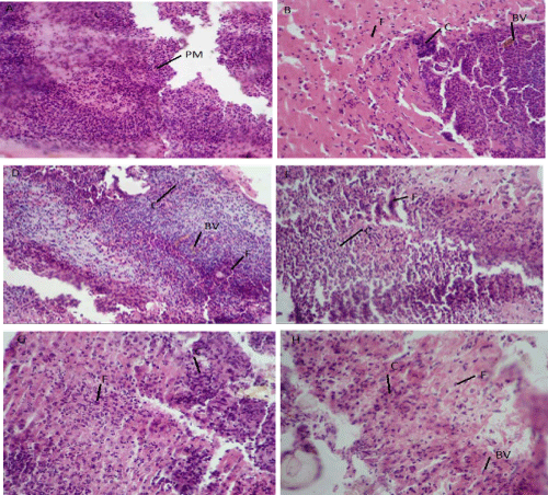 | Figure 2: Photomicroscopic view of histopathological characteristics of 9-day-old wound tissue section by Excision and Dead space model (Hematoxylin and eosin×40). a) Wound tissue treated with control b) Wound tissue treated with standard c) Wound tissue treated with ethanol extract d) Dead space model with ethanol extract (100 mg/kg) e) Dead space model with ethanol extract (200 mg/kg) f) ead space model with ethanol extract (400 mg/kg). |