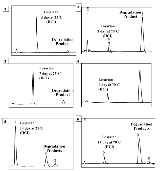 stress conditions: 1- Methanolic solution under 1.0 M HCl at 25°C after 3 days. 2- Methanolic solution under 1.0 M HCl at 70°C after 3 days. 3- Methanolic solution under 1.0 M HCl at 25°C after 7 days. 4- Methanolic solution under 1.0 M HCl at 70°C after 7 days. 5- Methanolic solution under 1.0 M HCl at 25°C after 14 days. 6- Methanolic solution under 1.0 M HCl at 70°C after 14 days. |
