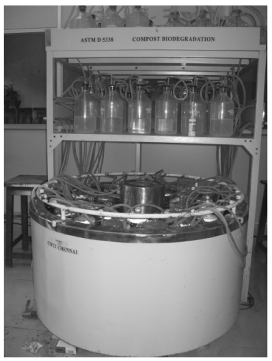 | The principle of the widely used CO2 evolution test (ASTM 5338- 98) was the determination of the ultimate biodegradability of organic compounds by aerobic microorganisms, using a static aqueous test system and the evolution of CO2 as the analytical parameter. A 1.50-liter test mixture was prepared in 2-liter vessels containing an inorganic medium and the organic compound as the sole source of carbon at a concentration of 10 to 40 mg of organic carbon liter-1. Usually organic fraction solid compost, obtained from a wastewater treatment plant or from another source in the environment, was used as mixed inoculums. The vessels were aerated with 1 to 2 bubbles of CO2-free air per sec (50 ml min-1) and incubated at 58 ± 2°C for usually minimum 45 days. The bigamous CO2 formed during the microbial degradation was trapped in two external adjacent vessels (volume, 1500 ml) containing an aqueous Barium hydroxide Ba(OH)2 solution (0.25 N). Samples were taken at regular intervals to determine the amount of dissolved inorganic carbon (DIC) and to calculate the amount of CO2 produced with titrated Hydrochloric acid this evolved CO2 was compared with the calculated theoretical amount (Th CO2), and the degree of biodegradation was expressed as a percentage. |