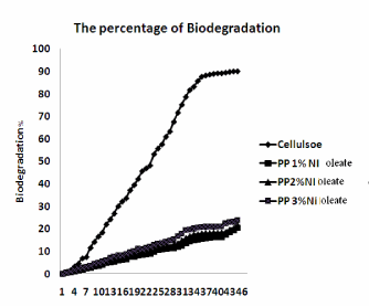| Figure 5 and Figure 6 shows Conditions of reaction mixtures: Organ of compost; livestock excrement, municipal and Vegetable waste used the method used for the determination of the biodegradability of the polyolefin’s was based on the International Standard (ASTM 5338-98) that measures the evolved CO2 amount from both the blank vessel without a sample and the sample vessel including a 10g LDPE and PP, Ni 12-hydroxyl oleate samples. According to the experimental 2.9 ASTM 5338 test procedure. Polyethylene and polypropylene the percentage of biodegradation 19% and 23% respectively. |