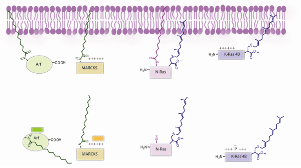 | Figure 5: Reversible membrane association is usually achieved by the presence of different membrane targeting motifs. This is the case for isoprenylated and myristoylated proteins which require either another lipid (palmitoylation of N-Ras) or a polybasic stretch (K-Ras4B, MARCKS). Release from the membrane can be achieved by depalmitoylation (N-Ras), phosphorylation of residues near the polybasic stretch (K-Ras), or binding of ligands (MARCKS, Arf). |