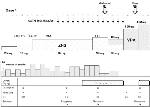 Time course of treatment in Case 1. The abscissa (1 to 30) denotes the number of days after starting treatment with ZNS. (CT: computed tomography;US: ultrasonography).