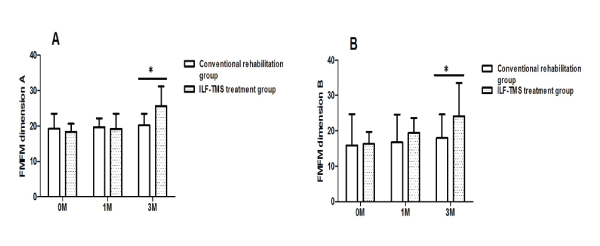 Figure 3: Results of Gross motor function assessed by FMFM in ILF-TMS group and conventional rehabilitation group (A) The changes of dimension A in GMFM in ILF-TMS group and conventional rehabilitation group (B) The changes of dimension B in GMFM in ILF-TMS group and conventional rehabilitation group (*P< 0.05) |