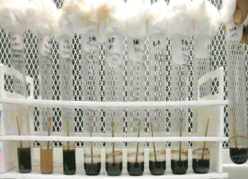 Enrichment culture of bacterial isolate Tubes a) B 1.1; b) B 1.2; c) B 1.3; d) B 1.4; e) B 1.5; f) B 1.6; g) B 1.7; h) B 1.8; i) B 1.9; j) B 1.10