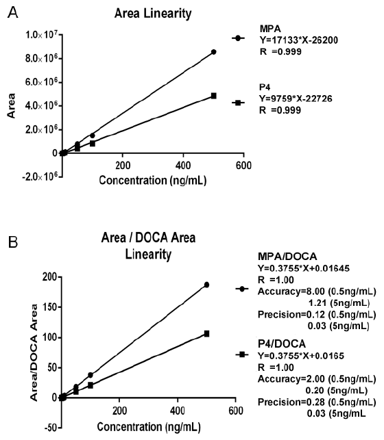 | Figure 3: Linearity of Standards. A) MPA responses are linear from 0.05 to 500 ng/mL. B)The response range remained linear when corrected using the internal standard DOCA.The accuracy and precision of two individual standards 0.5 and 5 ng/mL are indicated. |