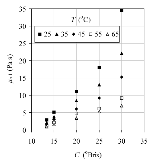 Variation of apparent viscosity (at a reference shear rate of 1.0 s-1) of kiwifruit juice with solids concentration at various temperatures.