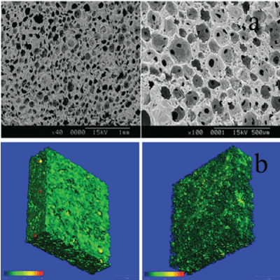 a) Morphology of the porous PVA-PCL scaffolds as observed by SEM, 1b) Micro CT images of PVA-PCL scaffolds