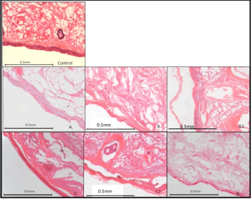 Figure 1: H&E staining of the skin (Original magnification x10): Control-visible nuclei in all skin layers; Protocol A-no visible nuclei; Protocol B-no visible nuclei, however nonspecific haematoxylin staining in epidermis; B2 (second cycle B)-no nuclei; Protocol C-visible nuclei in all layers; Protocol C2 (second cycle C)- nuclei number reduced still visible; Protocol D-No nuclei visible 0.Srmn 0.5mm. |