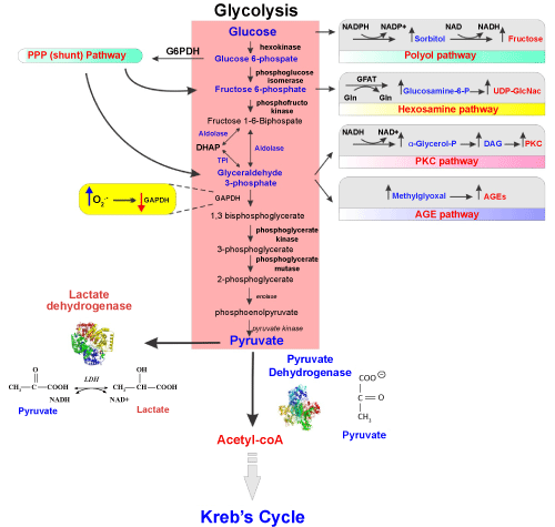 Figure 3: Glucose metabolism and oxidative stress: Glucose metabolism and energy production starts with glycolysis where glucose undergoes a series of metabolic steps to produce pyruvate. Pyruvate can either enter Kreb’s cycle for further metabolism processing and energy production via aerobic pathways or get converted to lactate (ending its metabolic transformation). The intermediates formed during glycolysis can enter into different pathways of metabolism such as Pentose phosphate pathway (PPP), Hexosamine biosynthetic pathway (HBP), Protein kinase C pathway and advanced glycation end-product pathway (AGE). Glucose itself can also enter polyol pathway instead of glycolysis to form fructose. Altered glycaemia can hamper/affect any of these other pathways of glucose metabolism, leading to oxidative stress and potential cell damage. |