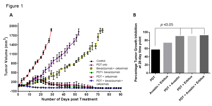 | Figure 1: (A): Tumor volumes were charted against days to assess the tumor response in various treatment groups. The combination therapy groups of PDT + bevacizumab, PDT + cetuximab and PDT + bevacizumab + cetuximab exhibited greater tumor response in comparison with other groups. Each group represents the mean (error bars, SE) of 10 animals. (B) Percentage tumor growth inhibition was determined for each treatment group against control at 28 day time point by using the formula, tumor growth control = (Vc-Ve/Vc) ×100, where Vc is the average tumor volume in control groups and Ve is the average tumor volume in the experimental groups. |