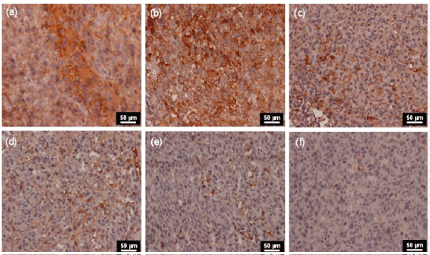 | Figure 3: EGFR expression was assessed in tumors treated with various treatment regimens using immunohistochemistry (a) Control (untreated tumor), (b) PDT, (c) bevacizumab + cetuximab, (d) PDT + bevacizumab, (e) PDT + cetuximab and (f) PDT + bevacizumab + cetuximab. All sections are shown at a magnification of × 200, scale bar = 50 μm. |