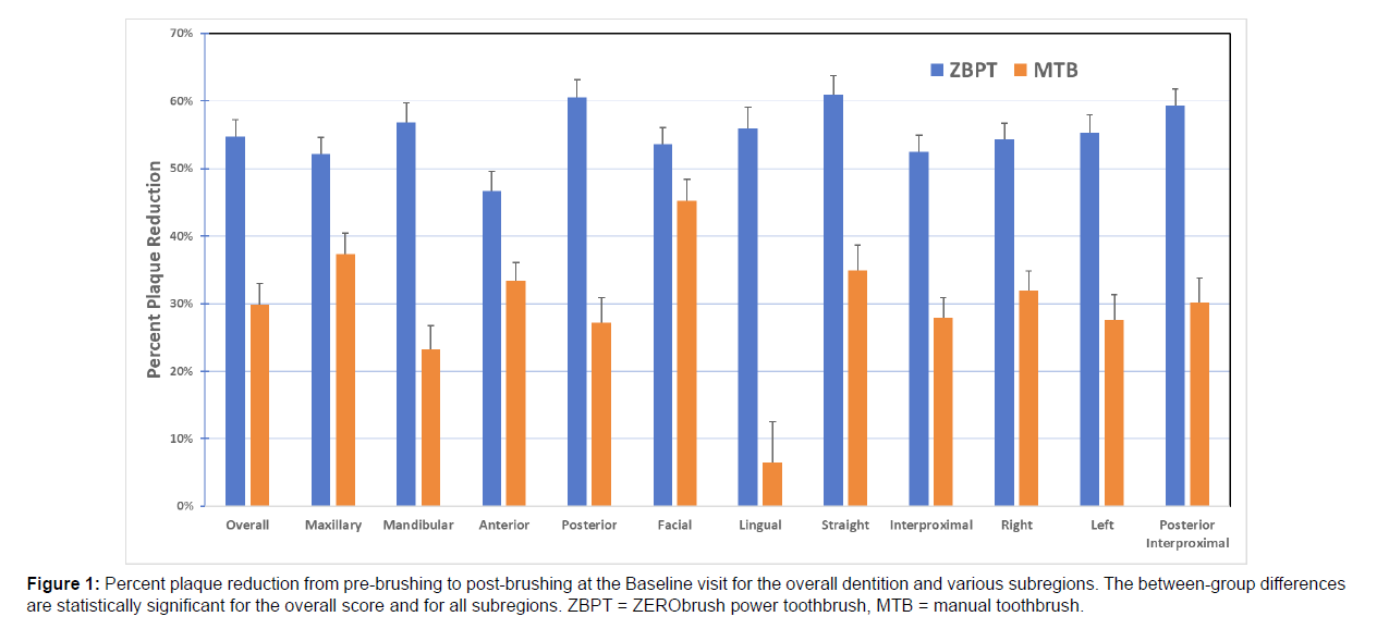 Figure 1: Percent plaque reduction from pre-brushing to post-brushing at the Baseline visit for the overall dentition and various subregions. The between-group differences are statistically significant for the overall score and for all subregions. ZBPT = ZERObrush power toothbrush, MTB = manual toothbrush.